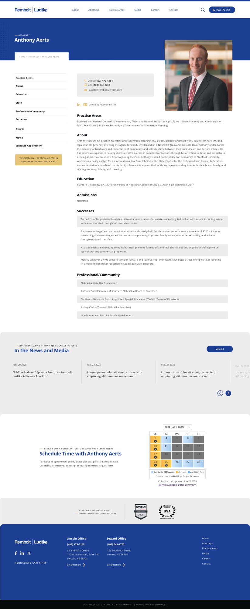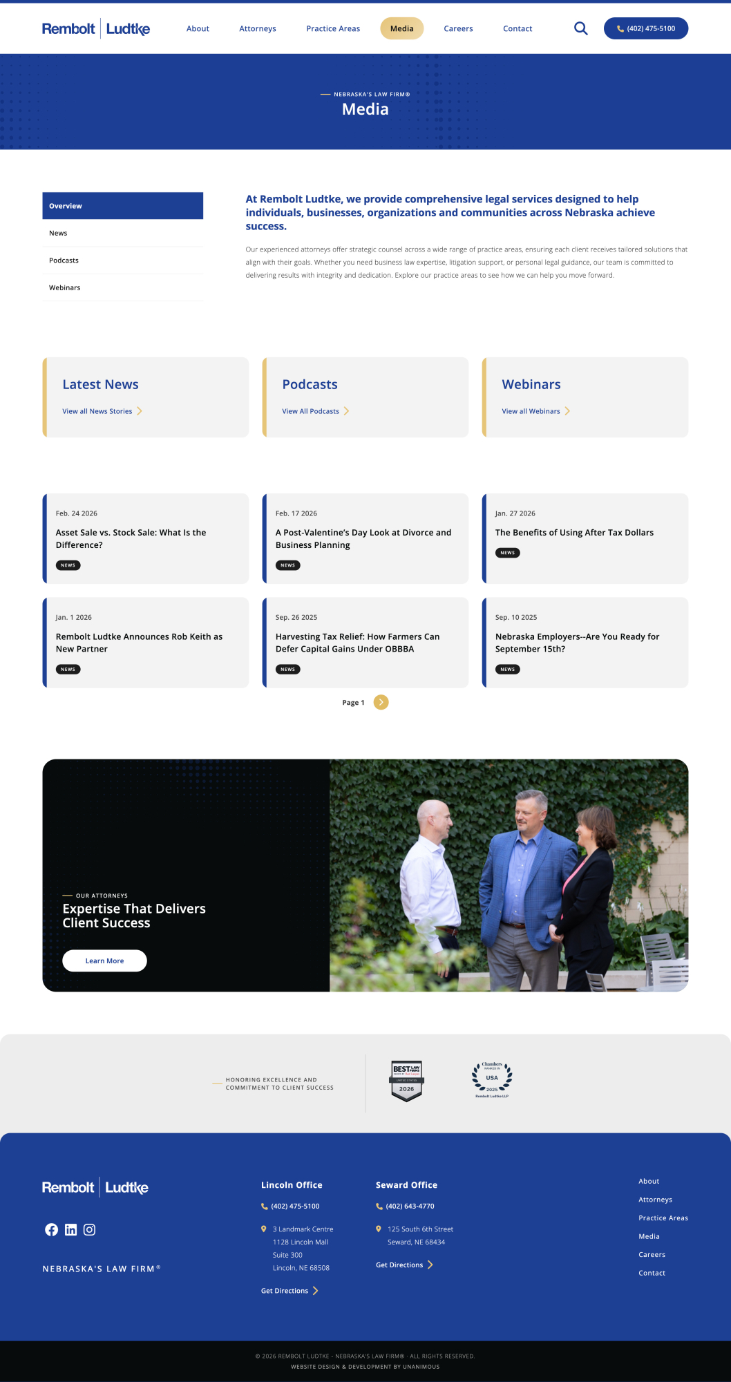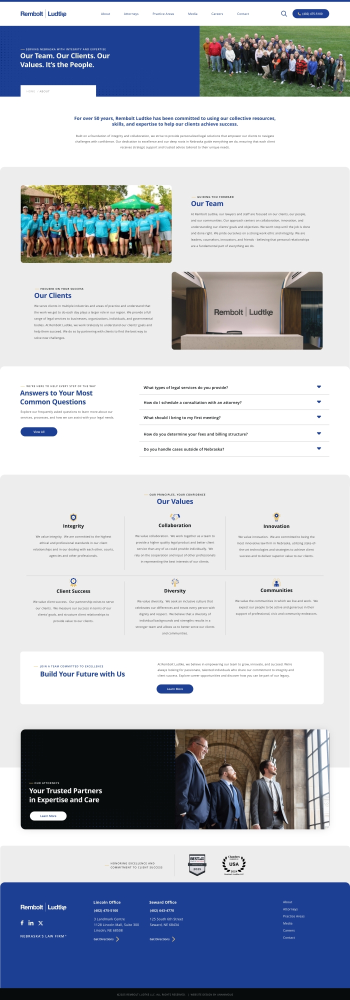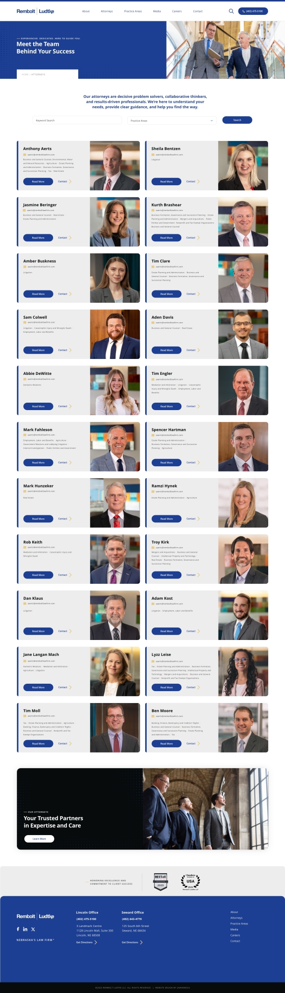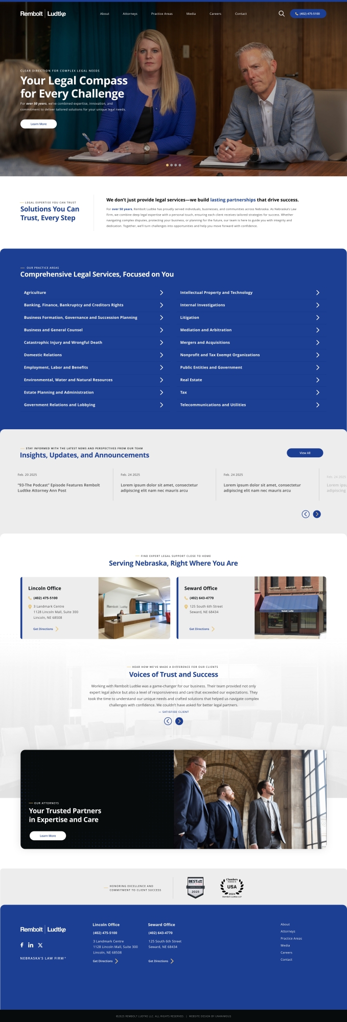 Remboldt Ludke is a full-service law firm based in Lincoln, Nebraska, with a long-standing reputation for trusted legal counsel and results-driven representation. With deep roots in the community and a focus on client-first service, the firm practices across a broad range of legal areas, including business law, estate planning, litigation, and more. Remboldt Ludke partnered with UNANIMOUS to create a modern, professional website that better reflects the firm’s experience, values, and evolving needs.